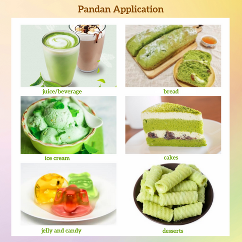 В последние годы использование листьев пандана в выпечке, напитках, кондитерских изделиях, мороженом, пудингах и т. д. становится все более популярным и демонстрирует тенденцию к быстрому росту. Короче говоря, основные виды применения порошка пандана заключаются в следующем: