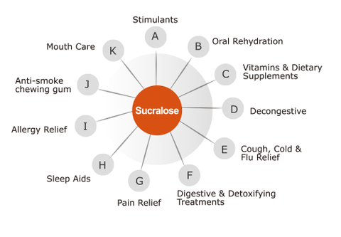 Сукралоза фармацевтического класса может улучшать вкус лекарств при использовании в фармацевтических препаратах в качестве вспомогательного вещества, не оказывая при этом негативного воздействия на естественный гомеостаз человеческого организма, а также не изменяя и не уменьшая действие указанных лекарств. Таким образом, он используется во множестве продуктов, таких как лекарственные сиропы, жидкие лекарства для перорального применения, сахарное покрытие таблеток, таблеток, быстрорастворимые лекарства, капсулы, лекарства от кашля, обезболивающие, регидратационные жидкости, снотворные, антигистаминные препараты, никотиновая жевательная резинка, пероральные препараты. средства гигиены, лекарства от кровяного давления, лекарства, способствующие пищеварению, витамины, пищевые добавки и т. д., чтобы заменить сахар в качестве основного подсластителя.
